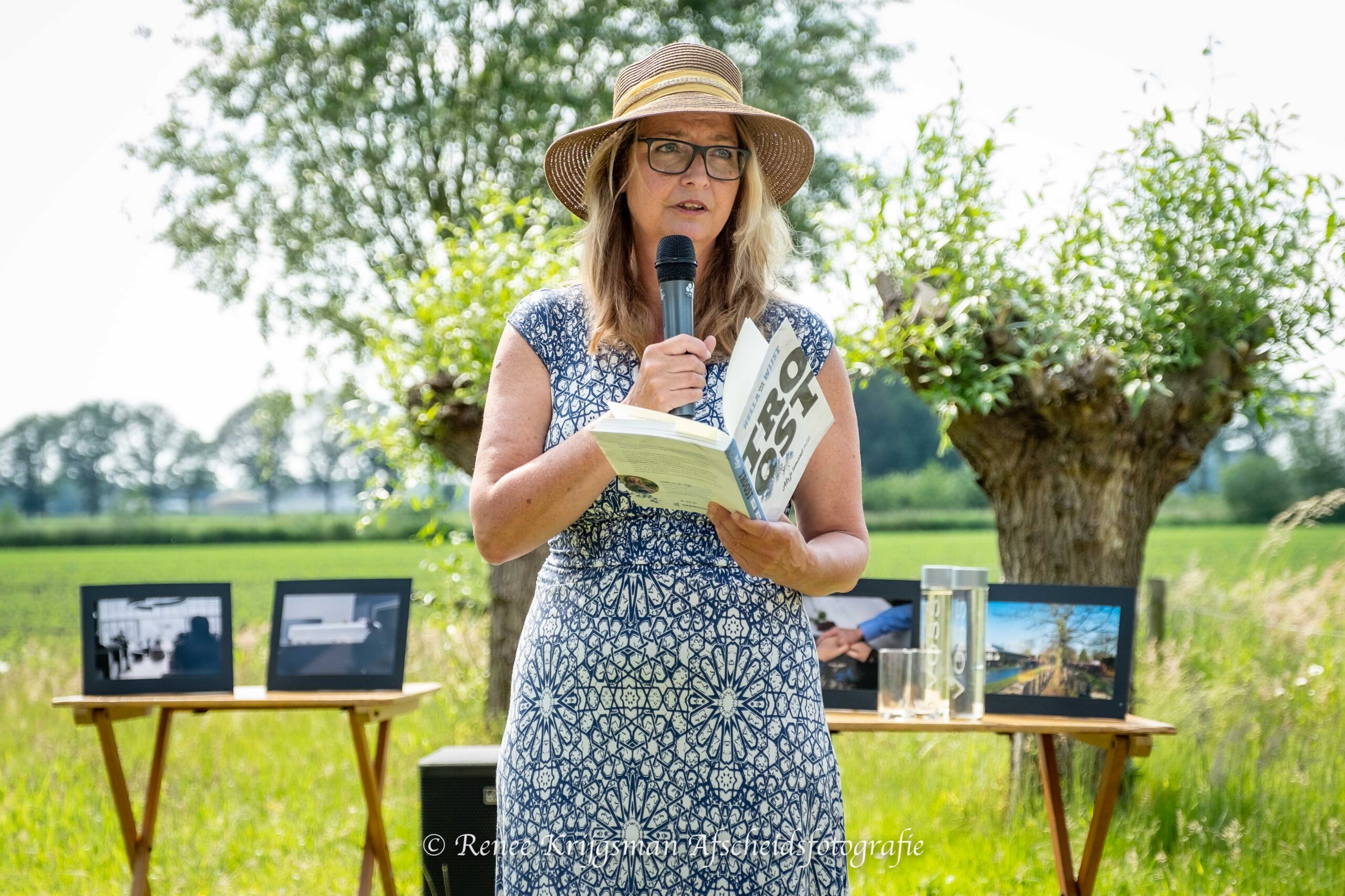Zie Hella hieronder met haar boek in de hand op een presentatie.